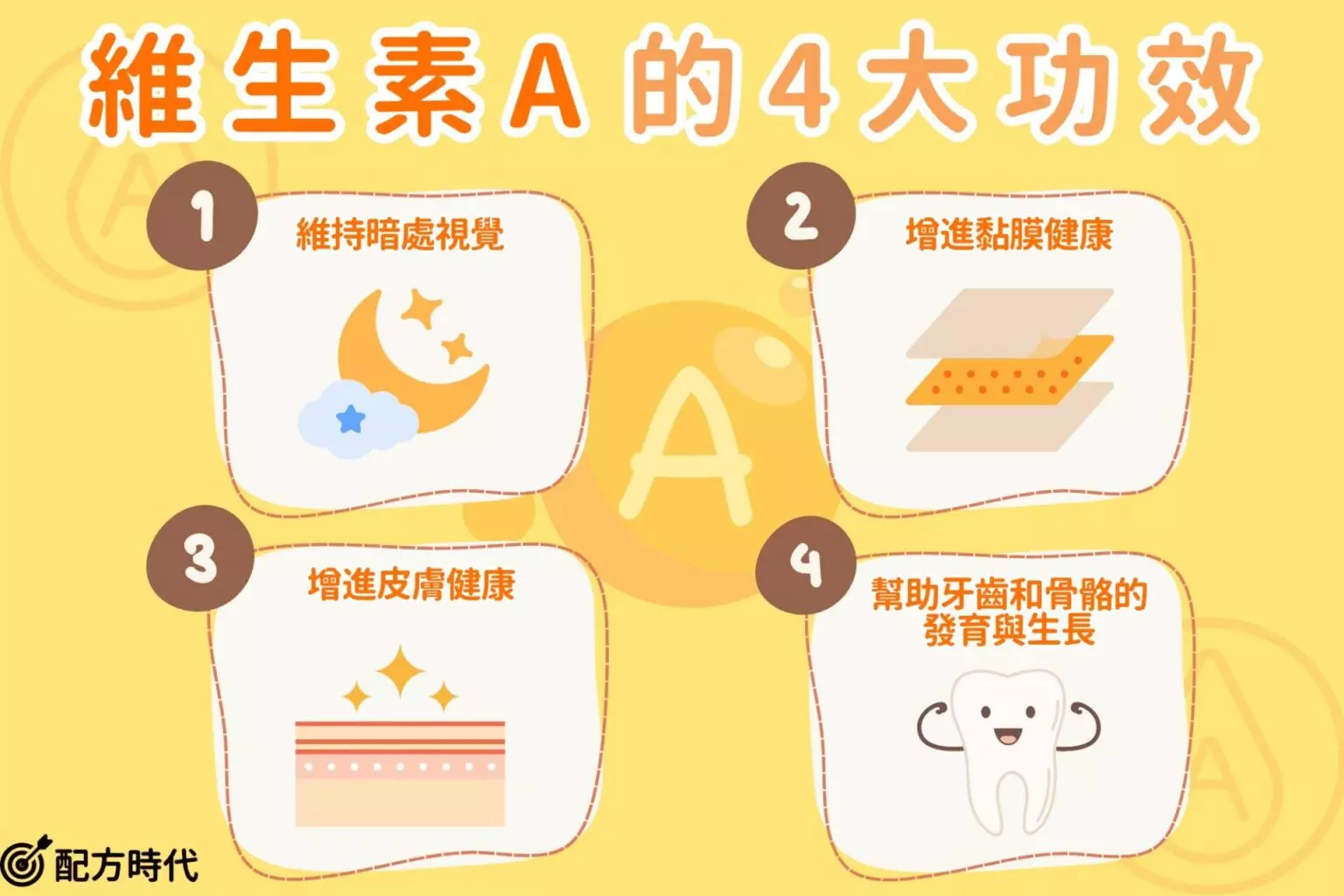 維生素A是人體不可或缺的必需營養素之一,對於夜間視覺、皮膚與黏膜的健康、牙齒和骨骼的發育與生長,都有很好的幫助